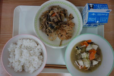 本日は、大豆の五目煮、きびなごのカリカリフライ、キャベツの甘酢あえ、ごはん、牛乳でした。大豆やごぼう、にんじんなどが柔らかく煮付けられており、とてもおいしくいただきました。「畑のお肉」と言われるように、大豆はタンパク質が豊富です。丈夫な体になること、まちがいなしのメニューでした。