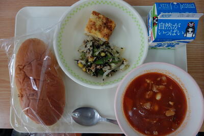 本日は、ポークビーンズ、スペイン風オムレツ、ひじきのマリネサラダ、ミルクパン、牛乳でした。