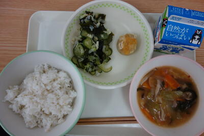 本日は、キムチトックスープ、にんじんシューマイ、きゅうりの酢の物、ごはん、牛乳でした。