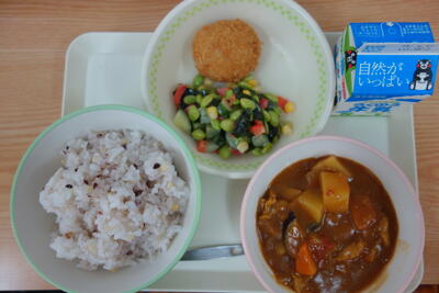 本日は南関あげカレー、ポークヒレカツ、えだまめサラダ、古代ごはん、牛乳でした。