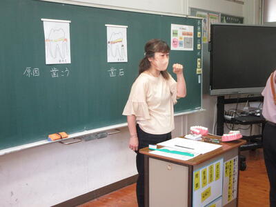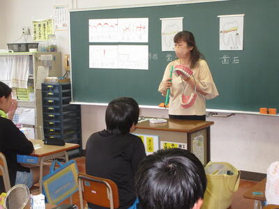 歯科衛生士の先生に来ていただき、歯を大切にする授業をしています。