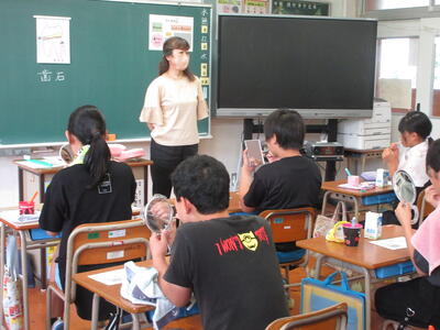歯ブラシの当て方や磨き方を教えてもらって、子供たちはすぐに確かめていました。