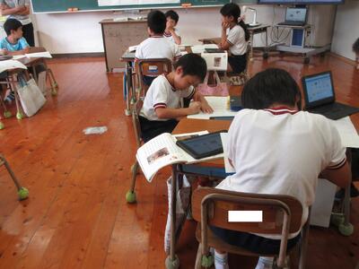 わけや工夫を一人学びで考え、グループで キーワードを探し、シートにまとめ、発表する。タブレット端末単元振り返りシートを活用しながら、動物園の獣医の朝の仕事の理解を深めています。
