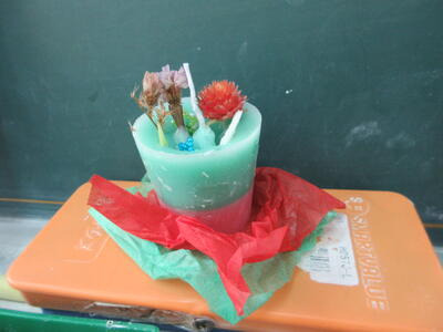 授業で製作したキャンドルを先生方にプレゼントしました。ろうに、クレヨンをとかしてきれいな色をつけたり、ドライフラワーで飾ったりと、とってもかわいいキャンドルです。