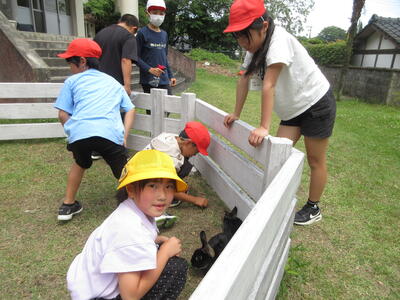 今日は1年生の4人がウサギとふれあう時間でした。昨年の6年生がつくってくれた、ウサギふれあい用柵の中で、ウサギに餌をあげたり、やさしくなでたりして、ウサギとふれあいゆっくり過ごす時間を過ごしました。
