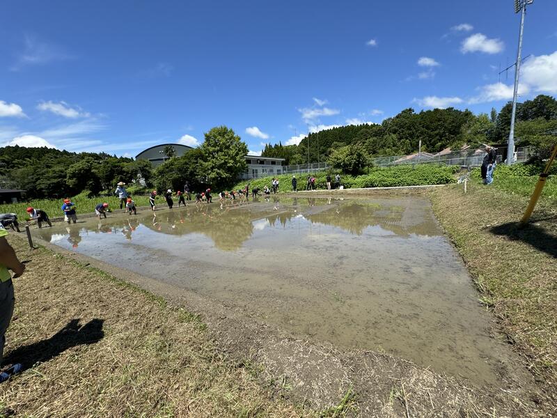5年生が学校横の相谷の水田で田植えを行いました。福山さんにお世話になり播種をして育ててきた苗を今日手植えをしていきました。