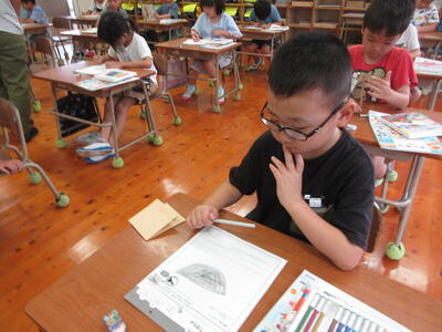 9月2日(月)、1年生は生活科授業で朝顔の種を採取し、よく見て描きました。