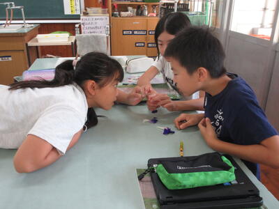 9月6日(金)、5年生は理科授業で朝顔の花でおしべやめしべを観察しました。