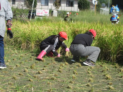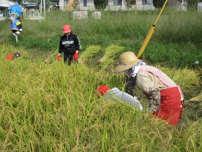 10月11日(金)、5年生は2時間目から学校横の田んぼで稲刈りを行いました。