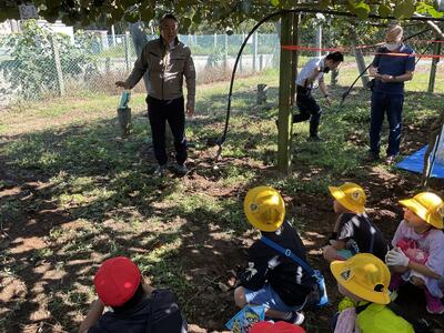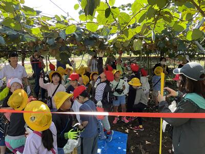 今年で3年目となる。毎年この時期に、三小校区にあるキウイファームに招待を受けて、子供たちがキウイファームを見学して、キウイの収穫体験を行っています。今年は、低学年(1、2年生)がキウイ収穫体験を行いました。