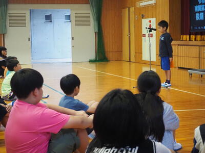 児童代表で2人が全校児童の前で立派に話してくれました。前期の頑張りを元に、後期の目標を新たに定めておりす素晴らしい発表でした。