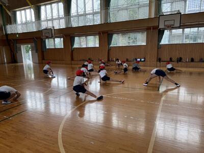 2年生は体育の授業で声をしっかり出して準備体操をしています。キビキビ動いて体操がしっかりできます。