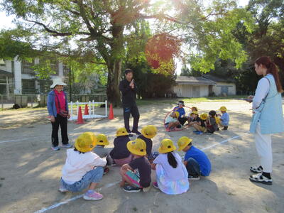 「よーい、スタート」で始めました。けんかやもめごともなく、ゲームをたのしむことができました。その後は、広い運動場で鬼ごっこを楽しみました。
