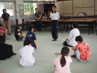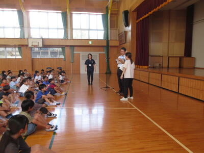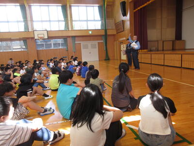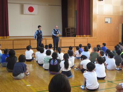南関町の交番からも来ていただき、避難訓練を見てアドバイスを受けたり、児童に対して不審者に会ったときの心構えを話されました。