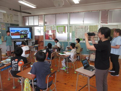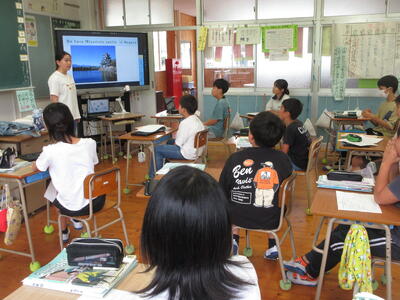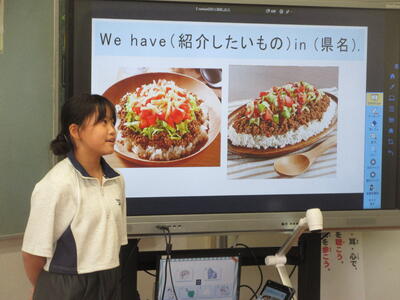 と学級のみんなに英語で尋ねられた後に、自分が伝えたい場所やもの、食べ物などについて話していきました。みんなとても良い相手意識を持った発表ができました。