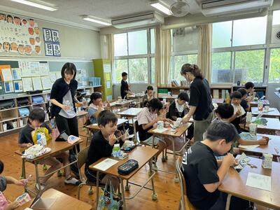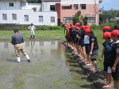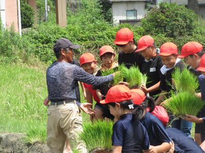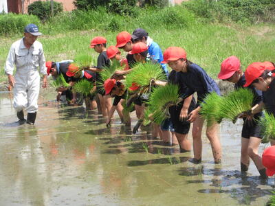 6月の強い日差しの下、5年生は総合的な学習の時間として、福山 正英先生を始め、相谷区の地域の皆様のご協力を得て田植え体験を行いました。この活動は、「食」と「農」について学ぶ学習の一環であり、子どもたちは普段食べているお米がどのように作られているのかを体感しながら学ぶことができました。