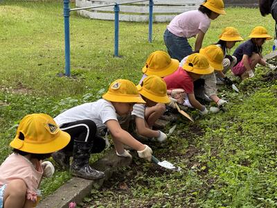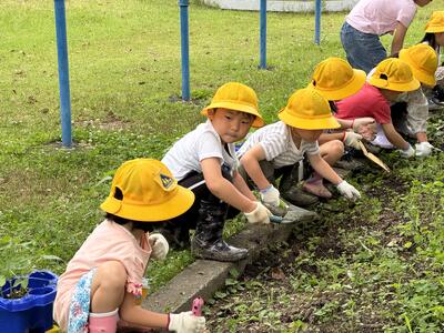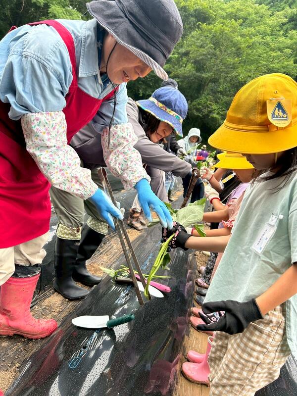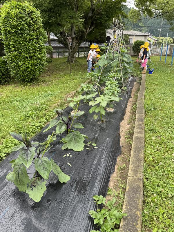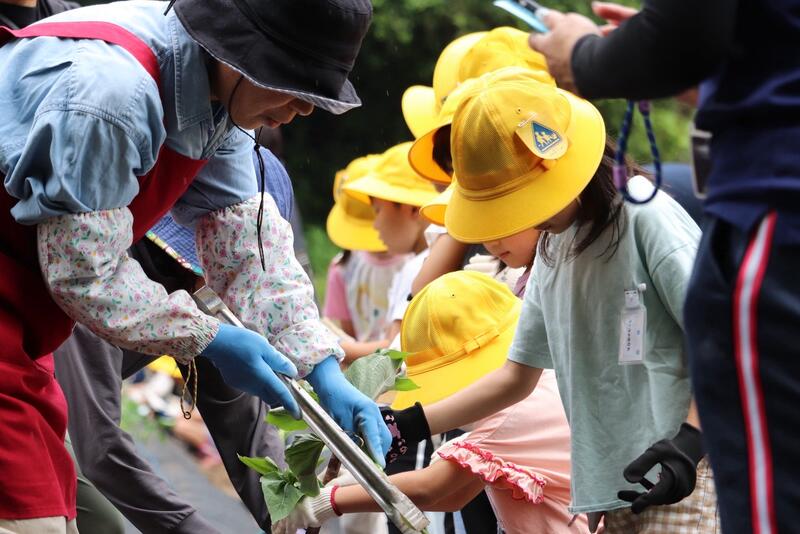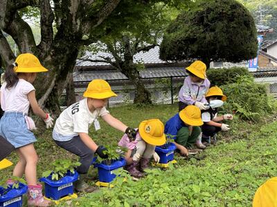 6月2日のさつまいも植えでは、福山さんや地域の方々や保護者の皆さんのお手伝いを得て、小雨が時折降る中子供たちがそれぞれ芋の苗を植えることができました。