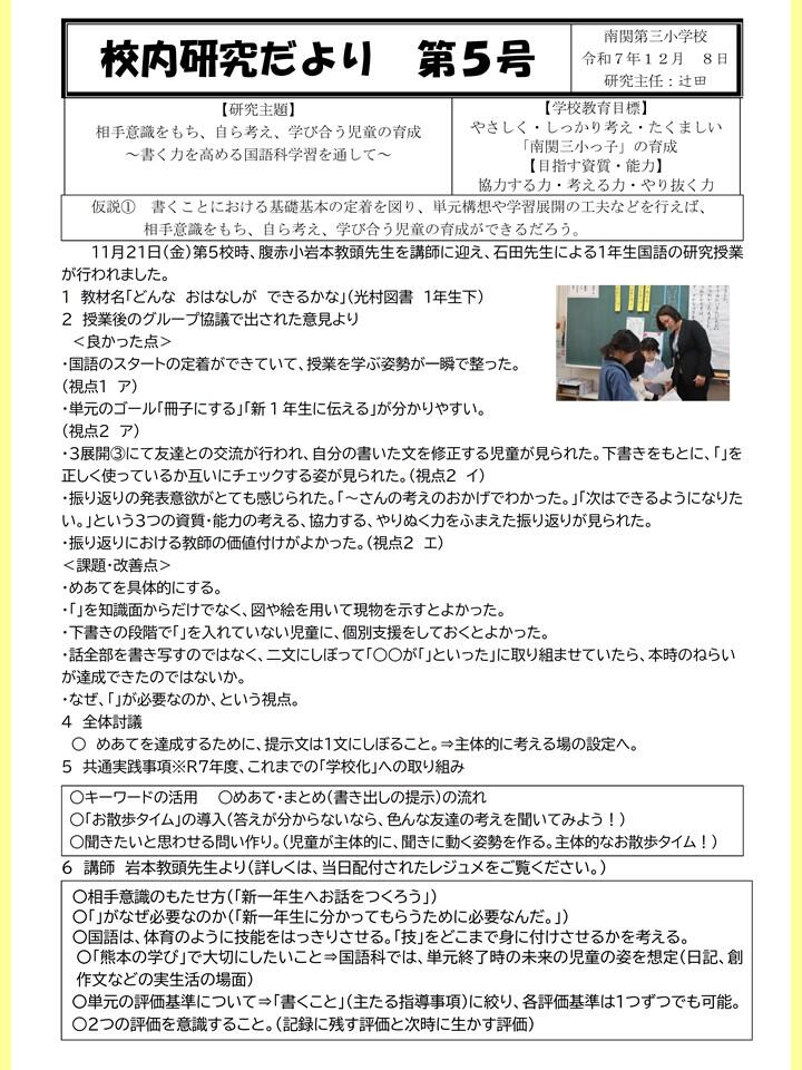 令和7年度南関第三小学校校内研究テーマ 「相手意識を持ち、自ら考え、学び合う児童の育成 -書く力を高める国語科学習を通して-」