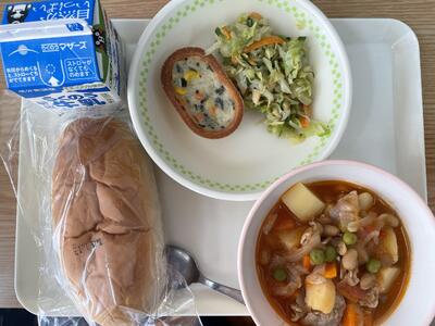本日は、ポークビーンズ、豆乳グラタン、アーモンドサラダ、ミルクパン、牛乳でした。