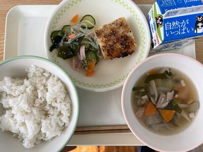 本日は、ご汁、鶏肉の香り焼き、じゃこサラダ、ごはん、牛乳でした。