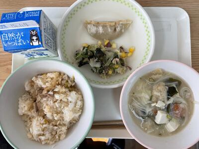 牛乳でした。今日のメニューは「ふるさとくまさんデー」で宇城地区の紹介でした。