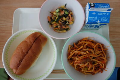 本日は、ミートスパゲティ、お豆のカレー風味サラダ、きなこパン、牛乳でした。