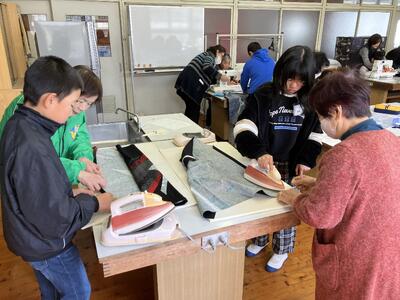 5年生は家庭科授業において地域学校協働活動でたくさんの方々からミシンの扱い方や縫い方を学習しました。
