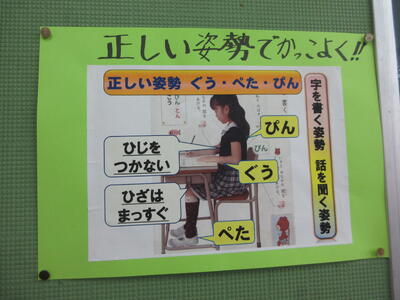 南関三小では、学習の始まりに「ぐう・ぺた・ぴん」を合言葉に、姿勢を整えることを大切にしています。 手は“ぐう”、足は“ぺた”、背すじは“ぴん”。 この小さな動作をそろえることで、子供たちの心がすっと学びに向かい、教室全体が落ち着いた空気に包まれていきます。