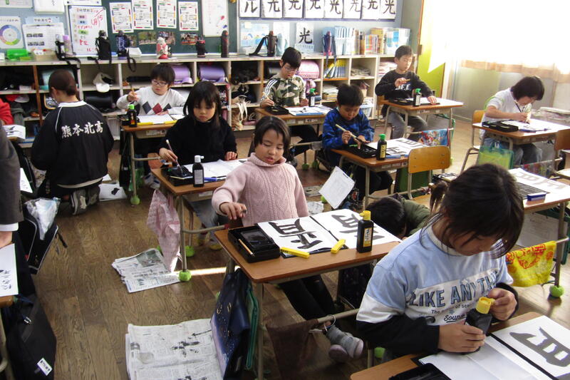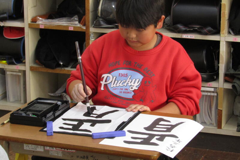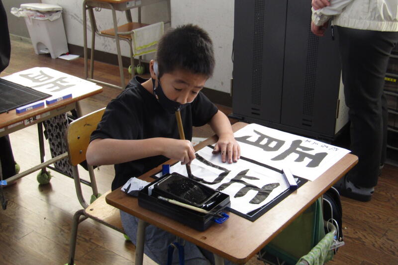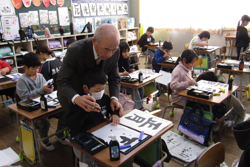 今日、4年生、2時間。3年生、2時間。習字の時間に大里先生に来ていただいて、ご指導をしてくださいました。子どもたちが書いている様子を見て、筆の向きや動かし方、姿勢などをアドバイスをくださったり、一緒に筆を持って筆の動きを導かれたりしていただきました。2時間ずつ各教室で一緒に習字の練習をしたら、みんな見違えるように堂々とした字が書けるようになりました。5年生、6年生も後日、ご指導していただきます。子どもたちのためのご指導。ありがとうございます!子どもたちも目に見えて上達するので、嬉しそうでした。