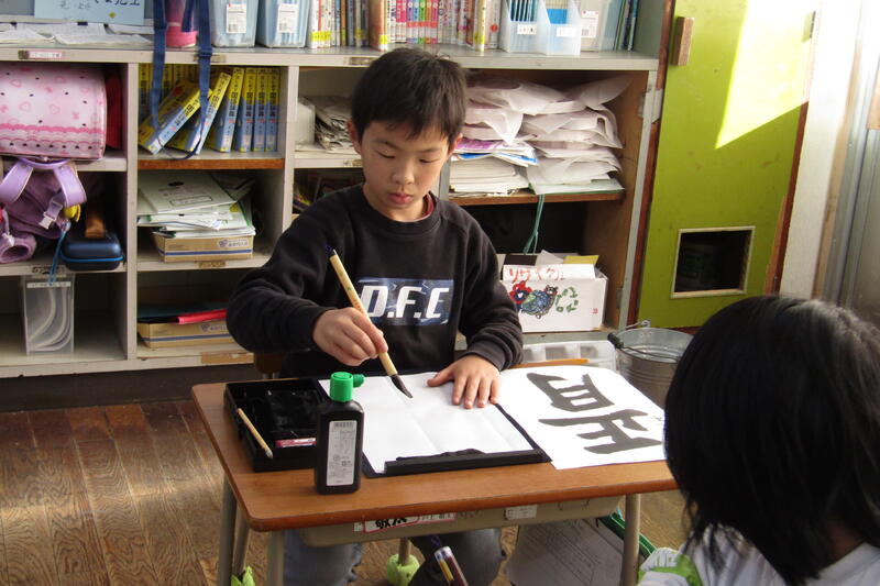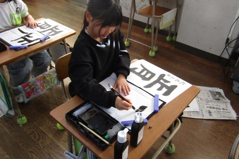 3年生は、今日から習字の学習が始まりました。元四小の校長先生だった大里 耕守先生がボランティアでご指導してくださいました。姿勢のこと、筆の動かし方について(始筆、終筆、筆の腹の動き)ご指導いただいたので、今日が初めてとは思えない出来でした。他に地域協働推進委員さん2人も一緒にご指導してくださり、よいところをたくさん褒めてもらいました。初めてでしたが、褒めていただいたので自信をもって取り組めていました。