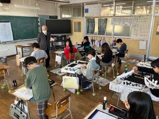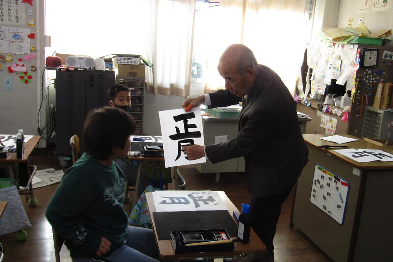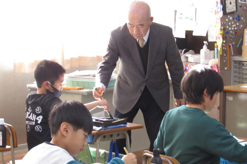 大里先生と習字の練習(3・4年生)