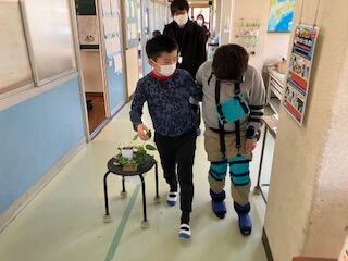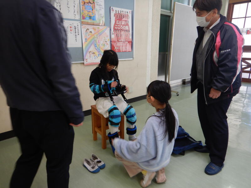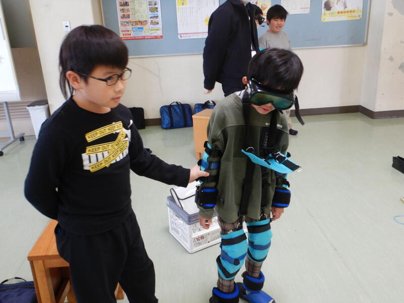 今日は、高齢者体験をしました。足や腕ににおもりをつけてゴーグルをはめて、歩きます。スムーズに動けず、苦労していました。2人組になって、歩いたり、介助したりしましたが、介助の仕方が分からない子どももいて戸惑いながら友だちを誘導していました。いろいろ体験することで、思いやりの気持ちも育つのだろうと思い見守りました。高齢者の方の気持ちに寄り添うきっかけとなる活動でした。