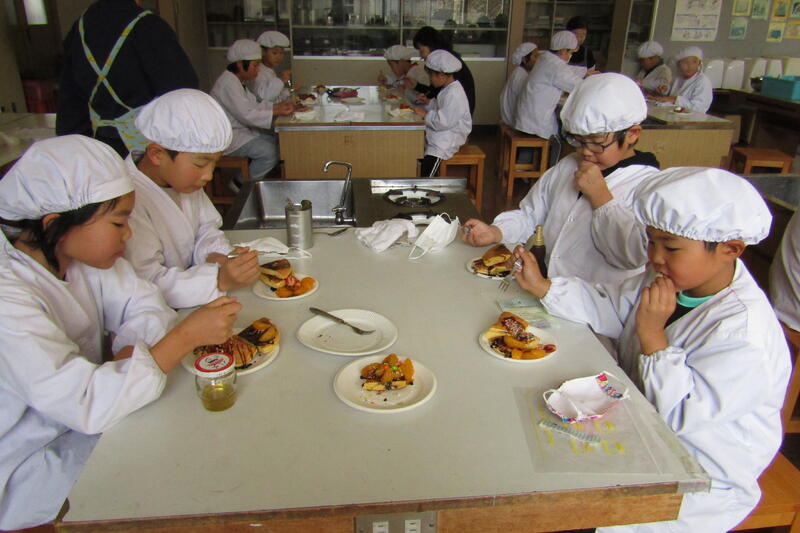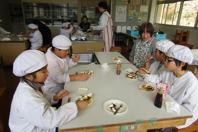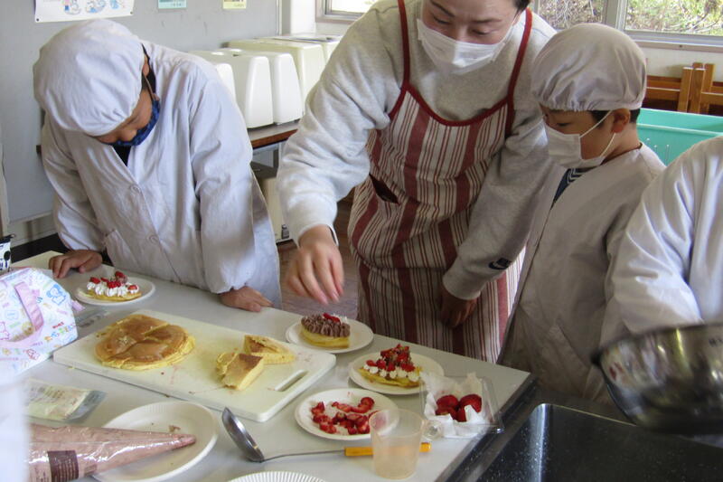 子どもたちは、体験活動が多い自立活動の時間が大好きです。生活の中に、生かせる事柄や技能を身につけるための学習が多いです。今回は、料理をしながら、家庭生活が生かせる技能などを学習しました。この活動の中で、友だちとの仲も深まります。今回もパンケーキをつくりながら、たけんこ学級の友だちと楽しく関わり合うことができました。