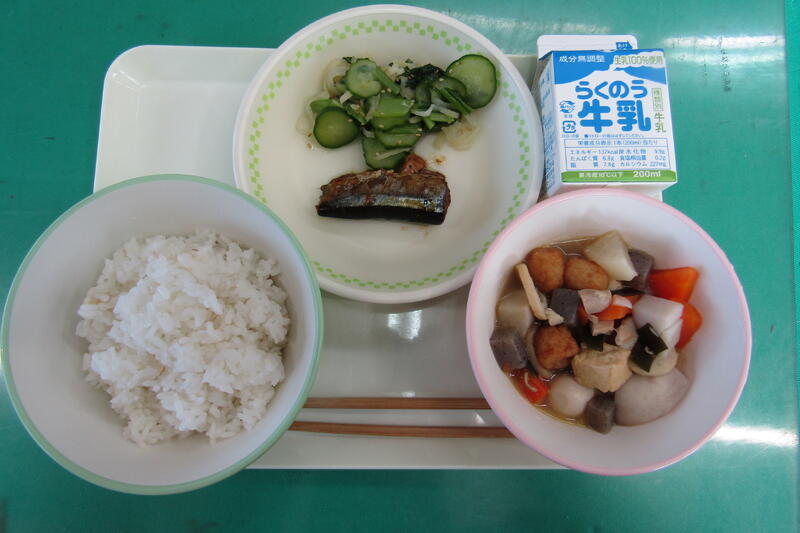 12月9日(火) 本日の給食は、麦ご飯、おでん、さんまの甘露煮、たくあん和え、牛乳でした。