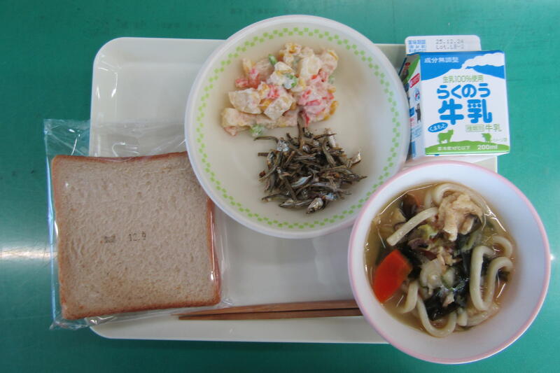 12月10日(水) 本日の給食は、黒糖パン、きつねうどん汁、ツナじゃがサラダ、いりこのりんかけ、牛乳でした。