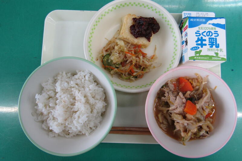 12月11日(木) 本日の給食は、麦ご飯、キムチ豚汁、揚げ出し豆腐の肉みそあんかけ、ごまあえ、牛乳でした。