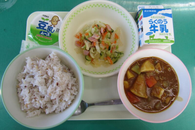 12月12日(金) 本日の給食は、古代ご飯、冬野菜カレー、ぷるるんサラダ、とうにゅうムース、牛乳でした。