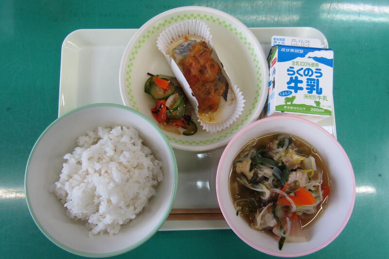 12月15日(月) 本日の給食は、麦ご飯、ちゃんこ汁、ホキのチャンチャン焼き、あっさり漬け、牛乳でした。