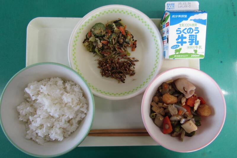 大豆の五目煮には、じゃがいも、こんにゃく、さつまあげ、こんぶ、だいず、とりにく、ごぼう、れんこん、にんじん、しいたけ、きぬさやの11種類の食材が入っていました。ごぼうやれんこん、だいずと歯応えのある食材もあり、しっかり噛んで、和食の良さを味わいました。キャベツの甘酢和えも、キャベツの食感がちょうどよく、ポリポリとおいしくいただきました。たくさんの栄養がとれる給食は、有り難いなあと思いながらいただきました。ありがとうございました。ごちそうさまでした!