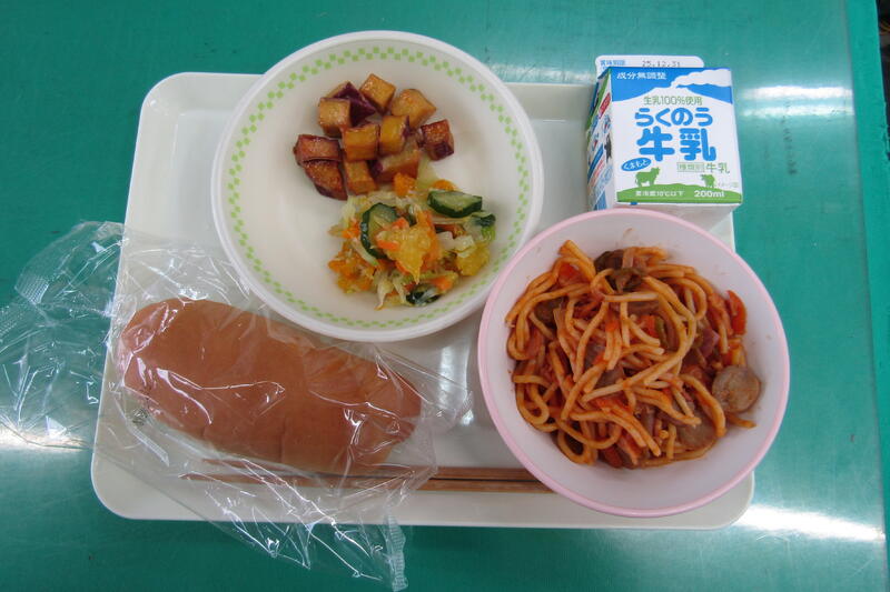 12月17日(水) 本日の給食は、コッペパン、ナポリタン、みかんサラダ、キャンディポテト、牛乳でした。