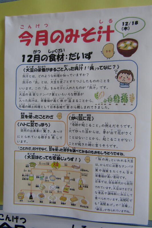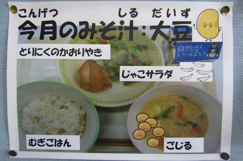 今月のみそ汁のご汁は、私にとって懐かしい味です。私の祖母が大豆を潰して作ってくれていました。小学生くらいまでは、なんか食べ慣れずに苦手なみそ汁でしたが、中学生ぐらいから大好物になりました。汁に大豆が残っていて、大豆の風味と白菜などのお野菜の味が相まって、美味しいみそ汁と感じます。今日のご汁もたくさんの野菜が入っており、おいしくいただきました。呉汁の「呉」とは、大豆を皮ごとすりつぶしたもののことを言うそうです。呉が入っているので呉汁(ご汁)といいます。今日の呉汁には、南関あげ、大根、ねぎなど南関町で作られた食材が入っていました。