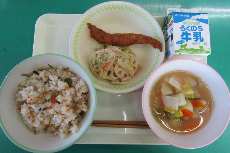 12月19日(金) 本日の給食は、びりんめし、白玉だんご汁、ししゃもフライ、ごぼうとれんこんのサラダ、牛乳でした。
