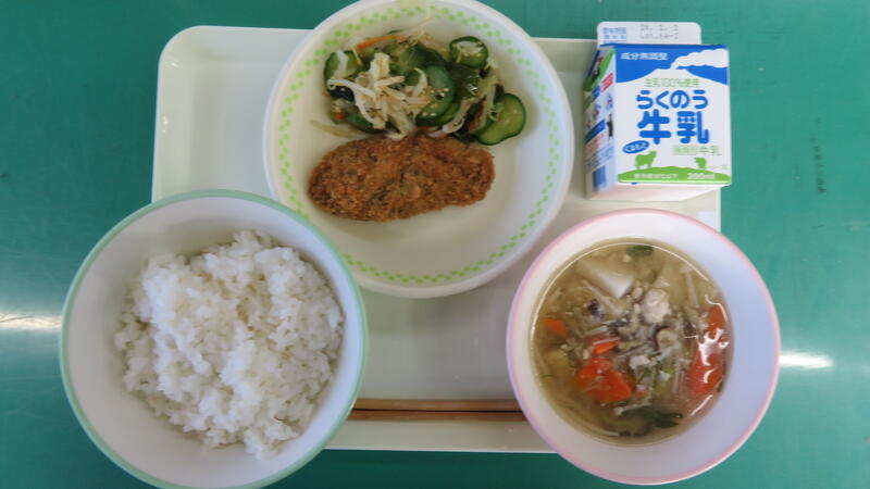 1月19日(月) 本日の給食は、麦ご飯、みぞれ汁、アジのハーブフライ、ごまあえ、牛乳でした。