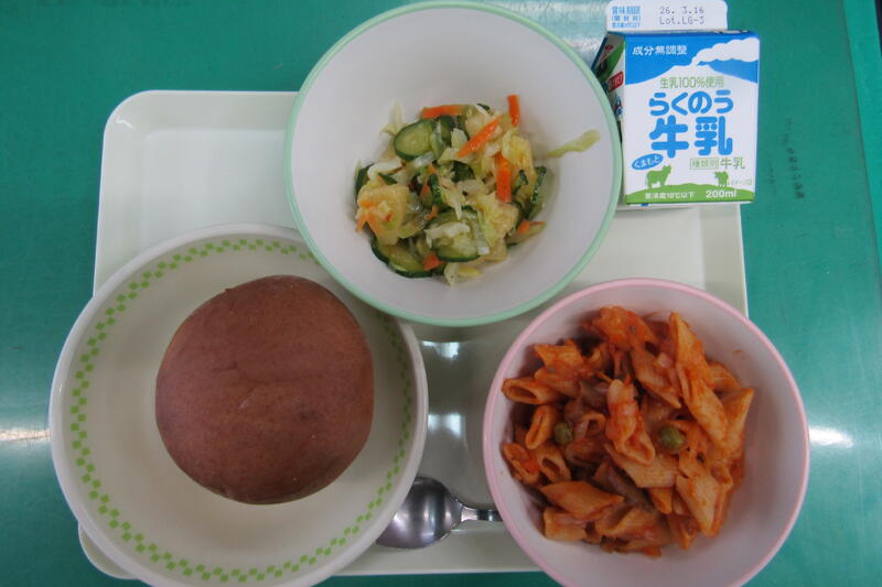 3月2日(月) 本日の給食は、きのこスープ、ペンネのミートソース、キャベツとパインのサラダ、牛乳でした。