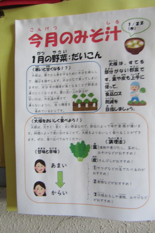 大根のみそ汁には、にんじんやしいたけ、とうふ、さつまいもが入った具だくさんでした。今日もおいしくいただきました。ありがとうございました。ごちそうさまでした!