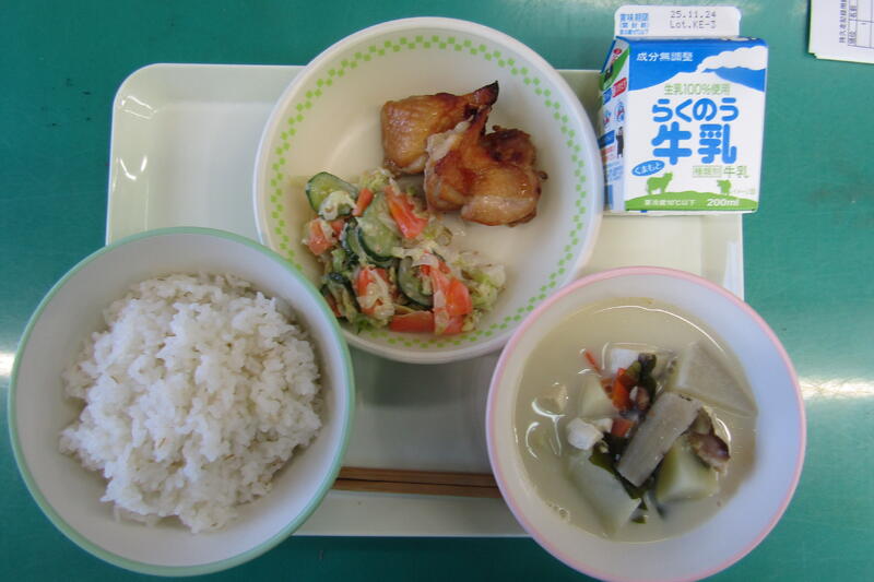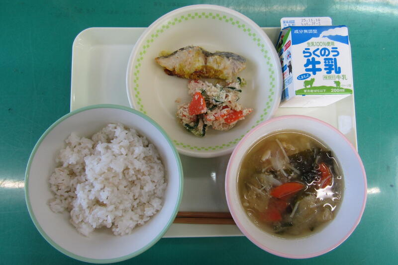 11月10日(月) 本日の給食は、あすか汁、とり肉のてりやき、ちくわと野菜のあえ物、麦ご飯、牛乳でした。