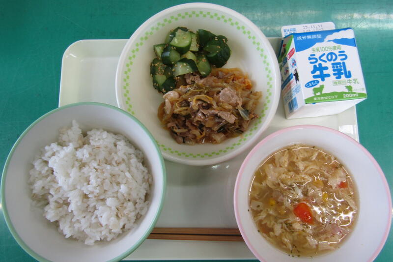 10月28日(火) 本日の給食は、麦ご飯、スーミータン、豚キムチ炒め、ごまきゅうり、牛乳でした。豚キムチは子ども用に作ってあるので、辛くはなく豚のうまみと白菜などの野菜のうまみがまざってとても美味しくて、子どもたちに人気のメニューです。今日もおいしくいただきました。ありがとうございました。ごちそうさまでした!
