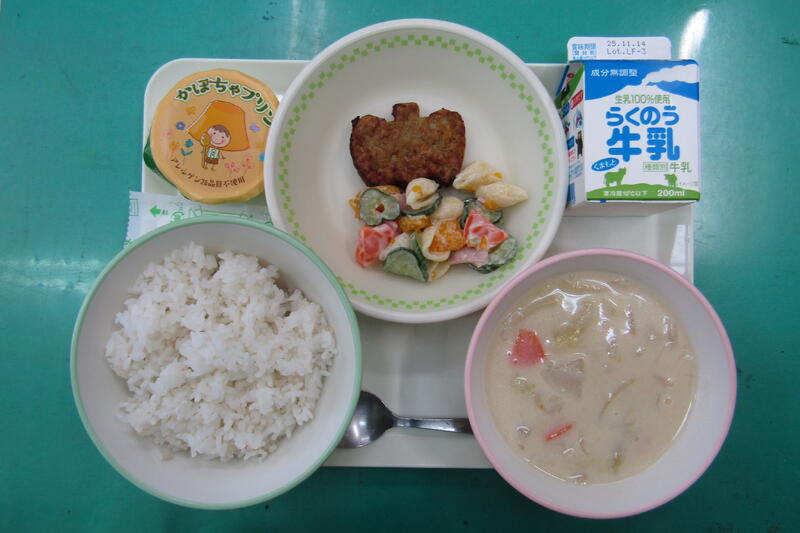 10月31日(金)本日の給食は、麦ご飯、豆乳チャウダー、かぼちゃ型ハンバーグ、マカロニサラダ、かぼちゃプリン、牛乳でした。