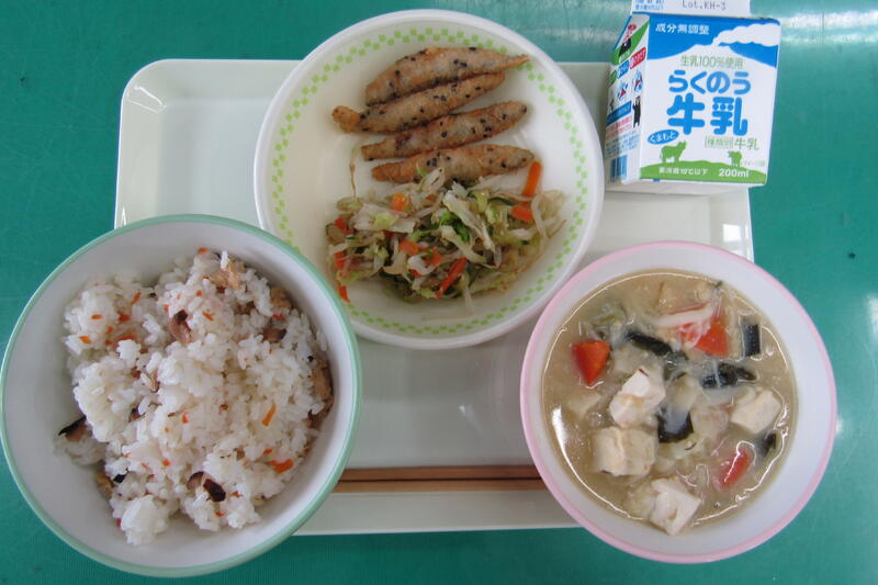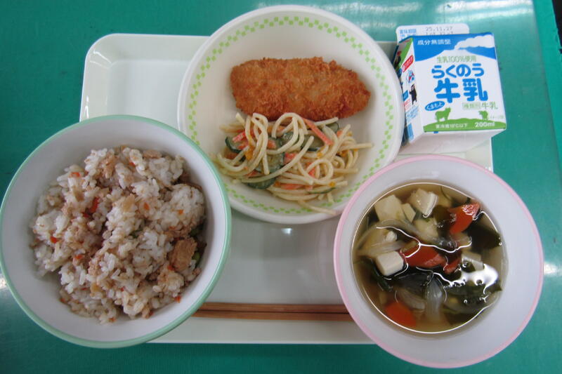 11月4日(火) 本日の給食は、なんかんあげの混ぜご飯、節そうめんのみそ汁、きびなとゴマフライ、ごま和え、牛乳でした。