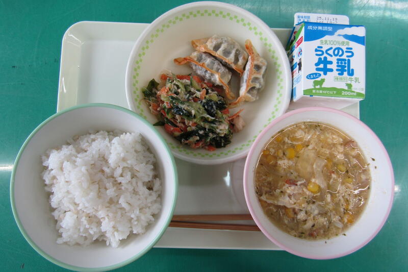 11月5日(水) 麦ご飯、スーミータン、ひじきぎょうざ、バンバンジーサラダ、牛乳でした。